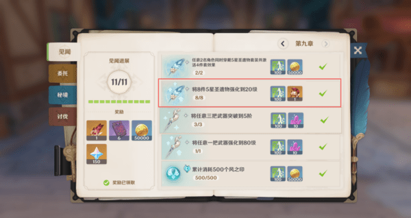 这里第九章有个八个满级五星圣遗物任务