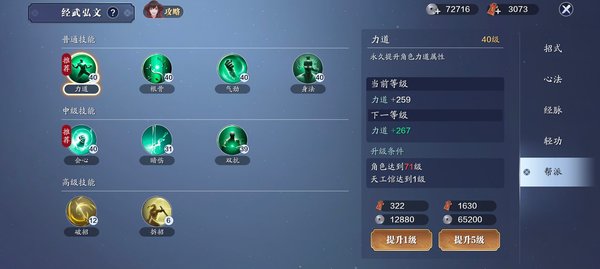 帮派技能,买满碎银和帮贡就是因为不够用,个人认为帮派技能培养优先度极高,点一级就是十多点的功力,普通和中级每次解锁必须点满,拆招破招看情况,毕竟太贵了