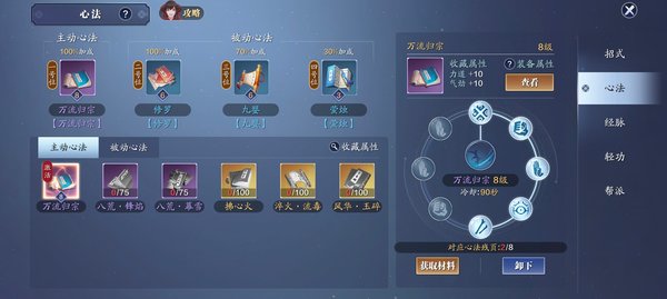 心法可以装一个主动三个被动(pvp不生效),这个主动紫是送的,升级需要残页我马上升满级了,但是个人建议不要升级,留着送的残页换一本紫色被动,优先推荐相菩提(百分比减伤),至于主动心法等下再说。