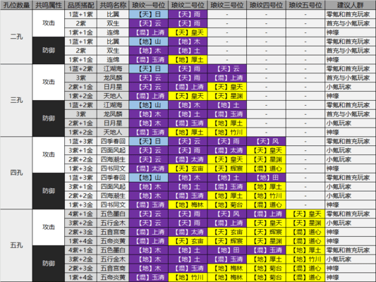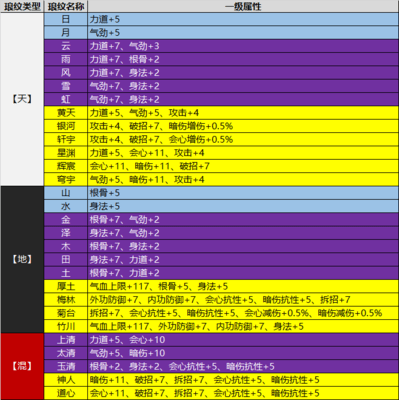 注:以上表格中,不同表格的颜色,代表该琅纹品质等级。品质由低到高,为蓝<紫<金。