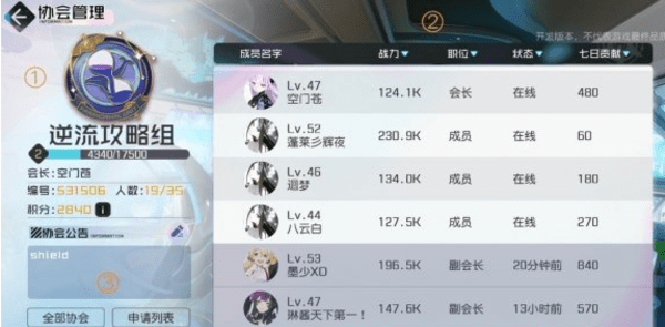 协会的成员列表。在此可以查看各成员的战力、职位、在线状态以及七日贡献。同积分相仿,七日贡献也是按照挑战协会副本的成果来计算的。贡献值最直观地反映出了一位成员参与协会活动的热衷度