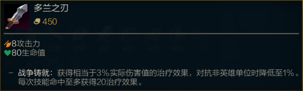 从小兵身上获得的回复前期更加低了,多兰剑前期的整体回复能力大幅度降低了,同时唯一被动也相当于削弱了多把多兰剑带来的收益。