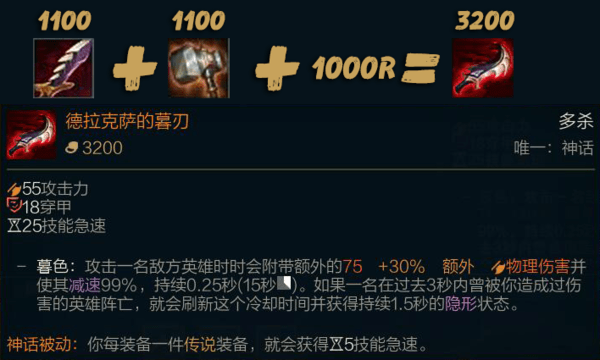 先看基础属性,对比爪子是少了5点攻击以及3点甲穿,多了15点冷却加速,但是神话被动提供的技能加速对刺客的提升肯定不如甲穿,能一刀扎死ADC绝对不出第二刀,其次附加的被动伤害也被砍了一刀,伤害远远没有爪子高,那你说幕刃被动能刷新,但刺客的目标一般只有一个,刷新的伤害基本无关紧要。