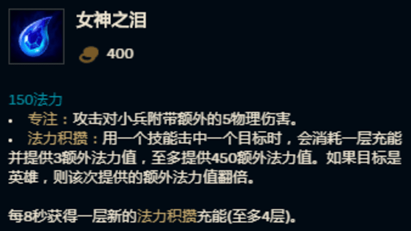 女神泪只有在自我感觉对线均势或者优势的情况下出,并且尽量对小兵叠,切忌前期为了快速叠女神跟对面英雄换血。