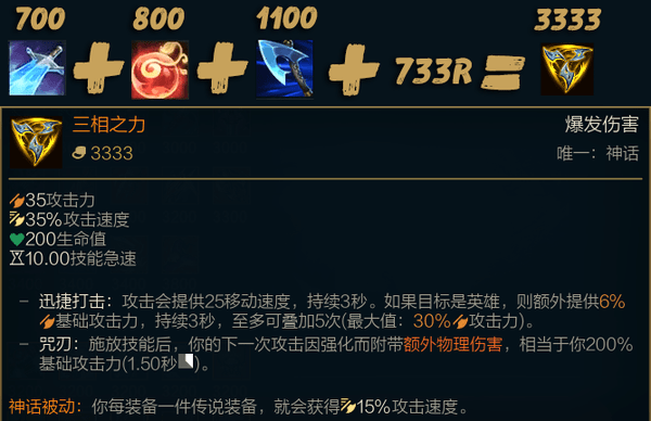 新版的三相,除了提供更多的攻速外(神话被动额外获得10%/件),它的两个效果其实是有着BUG之处的:迅捷打击(游戏里叫三重打击)会提供移速,而且在攻击英雄时提供百分比基础攻击力加成,至多提供5层,而咒刃的额外伤害基于基础攻击力,三重打击提升的攻击力会增益咒刃的伤害。