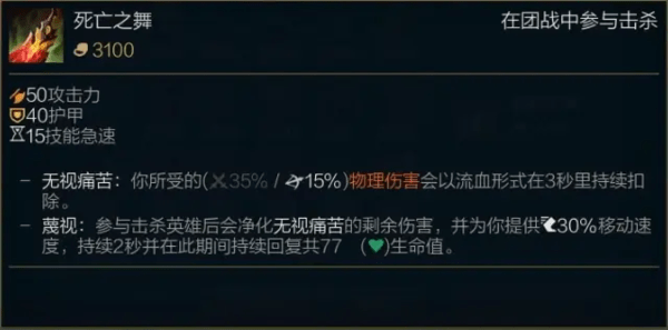 还有就是新版的死亡之舞了,基本上没变多少,没了魔抗,攻击力没变,然后护甲高了一点,价格降了,现在是只有减伤的被动,然后改成了参与击杀消除流血被动,吸血没了,这个装备我认为也是剑魔非常契合的,但是具体的表现得正式出来才知道因为现在S10我本身做这个这装备也很少,因为第一没有生命值第二,它的合成太占格子并且太贵了,伤害还低,但新版本便宜了500我觉得还是性价比不错的装备,但我有可能优先级不怎么做这个装备。