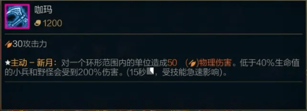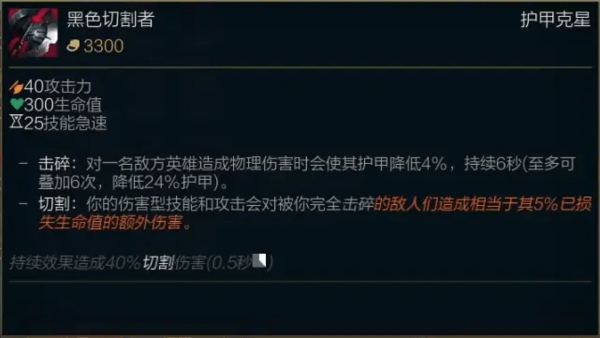 再来就是这件老装备了,新赛季里移除了被动的物理伤害增加移动速度的效果,取而代之的是更高的伤害,在击破对面护甲的时候会给与一个额外的已损失生命值的伤害,改装备在新赛季也依然契合剑魔,在测试服当时黑切战斧一起出甚至出现一种能秒对面上单的情况,因为有一个额外的伤害,剑魔本身又是个非常缺少额外输出手段的英雄,所以在局势均势或小劣势的情况下可以选择战斧加黑切的组合,生命值直接拉满,又肉又能抗伤害还不低,但要注意的是新赛季剑魔的机动性可能会出现一些欠缺,因为毕竟黑切不加速了,追人的手段可能需要从其他方面来弥补,但问题不大,反正大灭一开杀了一个英雄就往前冲就完事了。