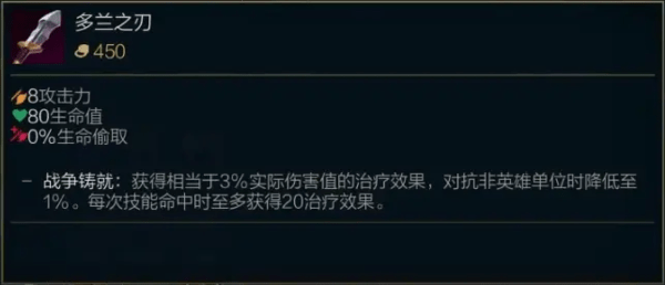 多兰剑可以说是改的很多了,平A对单位的吸血现在对小兵有减少加成,但是有一个很有意思的就是多兰剑的吸血现在技能也能触发了,而且在前期还非常的客观,可以说是比较自信的情况下必出的出门装了,能在前期帮助我们非常好的过渡到中期。