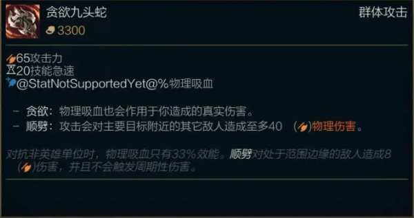 接下来就是贪欲了,这个装备可以说是在新赛季完美契合剑魔的一件装备,它的被动效果是可以被主动技能触发的,如剑魔的Q命中单位会触发提亚马特的被动效果,并且本身自带15%的技能吸血,也就是说这个东西是自带老死舞的被动并且能用技能触发提亚马特,可以说是大加强!