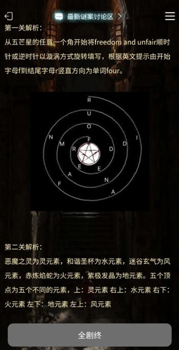 从五芒星的任意一个角开始将freedom and unfair顺时针或逆时针以漩涡方式旋转填写,根据英文提示由开始字母f到结尾字母r竖直方向为单词four。