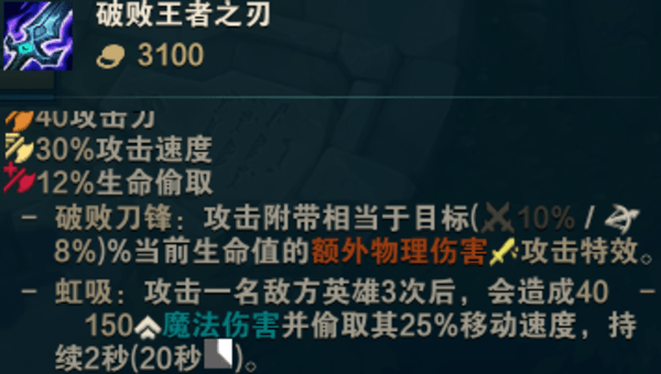 破败同样是给玩家的普攻附加百分比伤害,这三件装备的效果叠加之后薇恩在游戏中后期的伤害能力,击杀坦克是毫无压力的,毕竟真实伤害与百分比伤害都是游戏内最为优秀的属性。