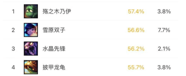 在10.23版本S11季前赛的韩服全英雄排位胜率中,阿木木以57.4%的胜率登顶榜首。