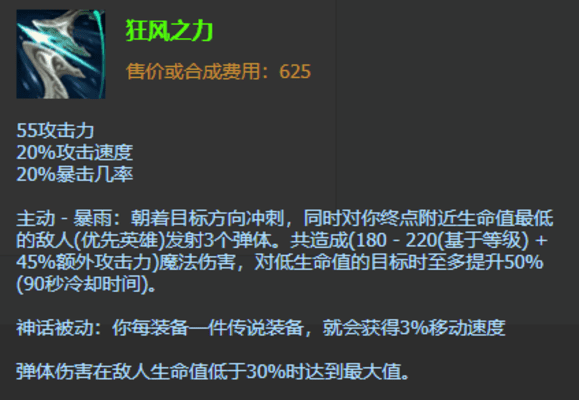 狂风之力提供的属性主要是攻速、暴击,所以这件装备对于AD英雄的适配程度是非常高的,最重要的是,这件装备的特效"暴雨"可以向前冲刺,这就大大提升了AD英雄的机动性,在S10赛季AD位一直被大家诟病,自保能力太差,很多没有位移的ADC都很容易被对手的刺客针对,所以大家在AD位的选择就比较单一,EZ频繁的出现在Rank中,在10.23新出的神话装"狂风之力"新加的主动位移,让不少AD具备了机动性。