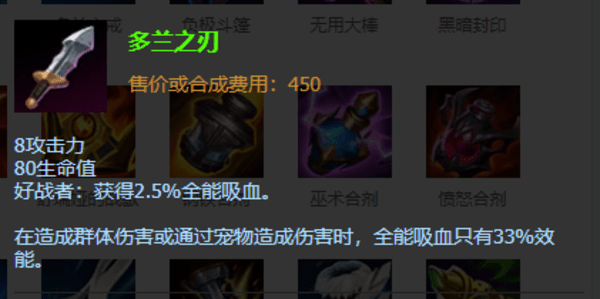 烬作为对线压制能力比较强的AD出门装的选择最好是多兰剑,能增加烬在对线期的补刀、发育能力,也可以更好的用平A、技能去蹭对手的血量,能更好的在前期对线来发育。