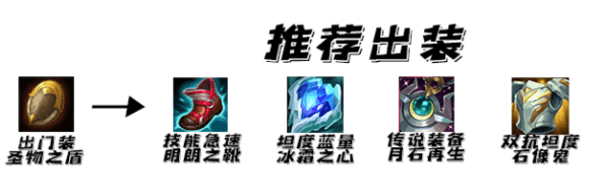 出门辅助装,随后先出CD鞋保证自己技能急速,紧接着冰心提供高额坦度和蓝量让宝石能够很好续航。神话装备我们作为第二个大件出能够保持宝石的作战能力。