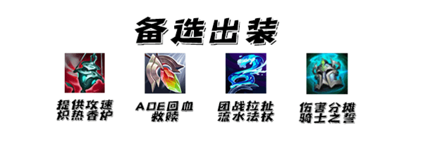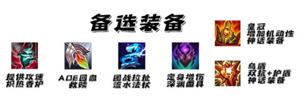 最后几件备选装备,这套出装的特点就是在于高伤害,能够早点结束游戏。所以我们在神话装备上着重进行选择。其他装备的选择根据我方阵容需要进行选择就可以。