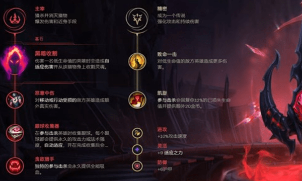符文中最好的成长性收割型符文,就是黑暗收割,可以无限叠加层数,在对方生命值低于50%的情况下触发,以黑暗收割来搭配收集者是最好的选择,也是目前女枪的主流基石符文选择。
