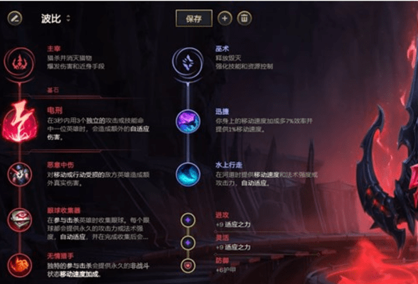 波比的另外一个额外伤害来源于符文,以电刑搭配恶意中伤来帮助波比打出短时间内的爆发,然后再打日炎的后续伤害,之后点出眼球与无情猎手。