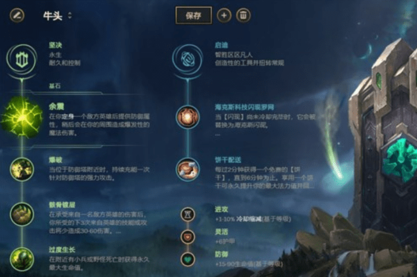 牛头的符文点法有两种,一种是余震流另一种是相位流,余震流的适用性更加广泛也更加稳定一些,点出爆破、骸骨或者调解来搭配过度生长使用效果最好。