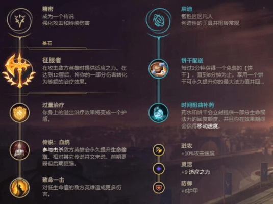 基石符文选择征服者,搭配过量治疗、传说血统以及致命一击,副系则是时间扭曲补药与饼干配送。