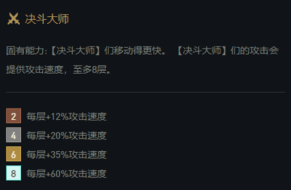 这套阵容是以赵信为核心的决斗大师三国阵容,6决斗大师羁绊需要有个天选之人,天选之人以赵信最佳,赵信要追出三星能发挥出最大威力。6决斗大师羁绊每层可以通过35%的攻速加成,最多可叠加攻速,赵信在释放技能后仍然可以回复法力值,三星赵信的技能每次释放技能可以叠加75点双抗,而决斗大师的高攻速能让赵信更快回蓝。