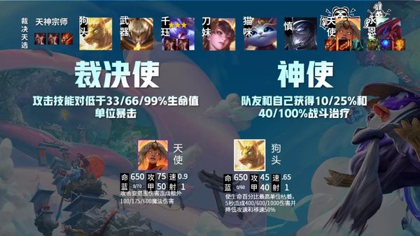 当前版本天使羁绊为天神和裁决使,天使能够和千珏、霞组成3裁决使,如果有天选裁决的情况下能够凑出4裁决使,4裁决使史诗级的提升,攻击血量99%以上的英雄都会产生暴击。
