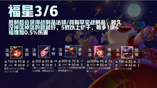 如果是6福星阵容,可以在后期卖掉塔姆、安妮等前期比较弱的棋子,用3福星搭配战神和其他高费棋子组成拼多多阵容,以此提升阵容后期战斗力。