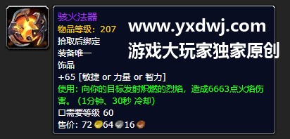 骇火法器是魔兽世界团本之中的德纳修斯大帝的掉落的一个饰品,饰品是加主属性价上浮一个1分30秒的直接伤害,不少的玩家们都不是很清楚这个饰品到底好不好用,小编在这里也给大家带偶来了一哦写相关的其他的攻略内容,低保开到这个饰品的或者团本掉了这个饰品不知道好不好用的,可以对照一下攻略,具体如下: