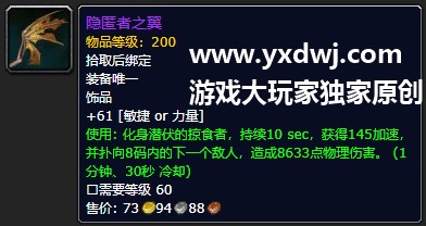 隐匿者之翼是团本纳斯里亚堡里面老一掉落的敏捷系的饰品,效果是可以主动使用之后,获得加速效果并且造成大量的物理伤害,其实是一款相当厉害的饰品,尤其是在PVP的环境之中,不少的玩家们也不知道这个饰品具体要怎么用,小编在这里也给大家带来了一些相关的攻略,有需求的用户不妨对照一下下面的攻略看看这个饰品好不好用吧,具体如下:
