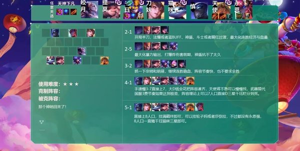 4-1彻底组成阵容,可能会没有天使和肾,没有关系,4阶段的关键就是凑2星千珏加4明昼,其他搭配前排和裁决即可,天使慢慢找,主要是后期的担当,帮助千珏清理群体单位,和天神狼一样,理论阵容在节奏快的大师以上局,可以直接7人口D到死找三星千珏即可,胡了再上八。