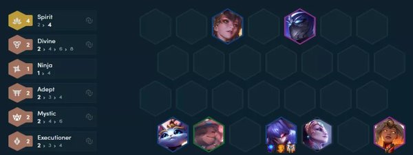 2-5上五人口,优先千珏装备,千珏是阵容的主C,和天神狼一样,虽然4费卡是后期的主力担当,但是分和绝大多数的节奏是千珏打出来的,现在前期豹子是被再次加强了,强度是很不错的,继续挂神盾或者明昼都可以。