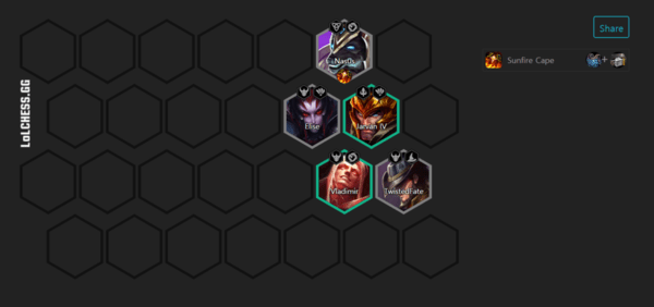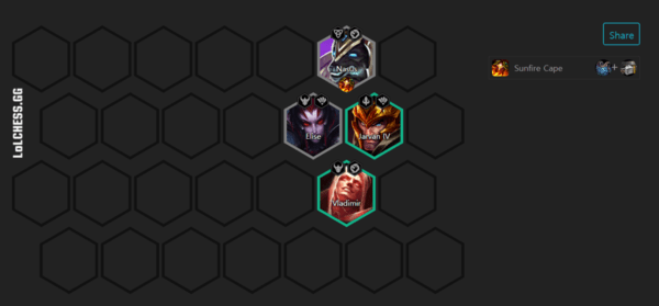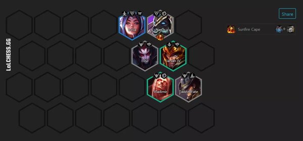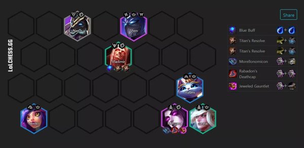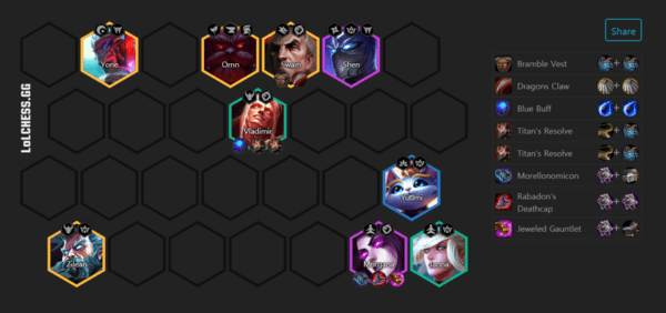 追出3星吸血鬼后直接拉8人口,8人口补充一个永恩帮助阵容打破防即可。这里永恩的地位很重要,因为这套阵容后期是只有坦度但是缺乏伤害,如果莫甘娜没有鬼书的话那完蛋后期输出根本跟不上。