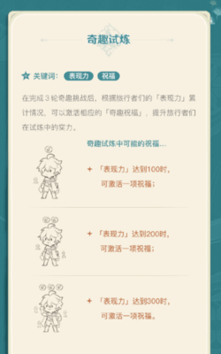 在完成3轮奇趣挑战后,根据旅行者们的表现力累计情况,可以激活相应的奇趣祝福,提升旅行者们在试炼中的实力。