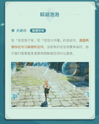 在泡泡急行军和泡泡大冲撞的挑战中,道路两侧存在可以躲避的空间,当密集的泡泡将要来临时,旅行者们需要留意道路两侧躲避空间的位置。