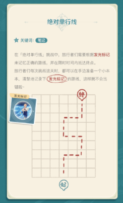 旅行者们每次挑战这关时,都可以在手边准备一个小本本,清楚地记录下发光标记的路线,这样就不会出错。