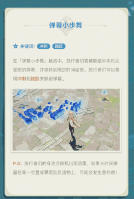 在弹幕小步舞挑战中,旅行者们需要躲避中央机关发射的弹幕,并坚持到限定时间结束,旅行者们可以善用冲刺和跳跃来躲避弹幕。