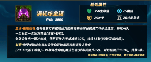 涡轮炼金罐的主动效果基本上就是老版的正义荣耀,开了以后朝敌人跑的飞快,还有个减速。主动效果的移速大提升可以作用在人马的被动上——额外移速越快攻击力越高,一脚直接能踢掉脆皮的半管血。