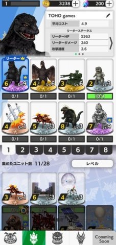 《GODZILLA BATTLE LINE》需要玩家在游戏中不断地收集更多种类的怪物来组成自己的哥斯拉战队,游戏中融入了历代哥斯拉电影中出现过的怪物,每一只怪物都有自己的基础属性和能力,玩家可以自由的选择不同的怪物出战,击败敌人赢得胜利。
