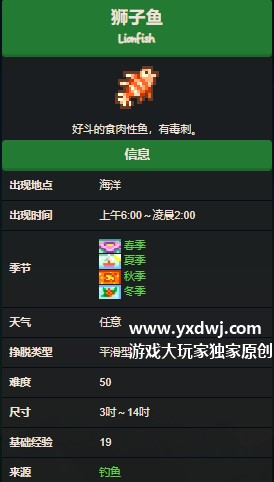 狮子鱼是一款玩家在游戏后期解锁姜岛之后才能够钓起来的鱼。