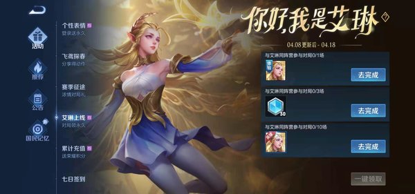 王者荣耀新版本来袭,S23赛季更新后完成任务可免费获取艾琳,玩家们使用艾琳的信物就可以去进行免费的兑换,我们在这里为玩家们提供了几个不同的途径来进行告诉大家怎么去获得艾琳,完成我们的游戏活动任务,轻松的去进行对局,发现不同的游戏乐趣。