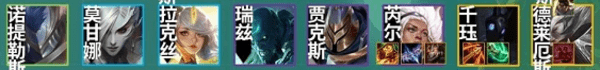 泰坦、莫甘娜、拉克丝、瑞泽、武器大师、芮尔、千珏、诺手。