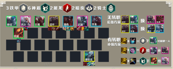 羁绊解读:铁甲全队加护甲,神盾开局加盾加攻,屠龙全队加法强,且刚好潘森巨魔2人就能出双屠龙,暗夜其实并非固定,他可以和黎明来回切换(见下面的变种),骑士全队格挡伤害