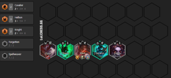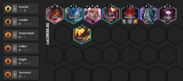 2阶段:3小恶魔开局加补任意骑士或者重骑兵,最好是锤石人马,如果有鸟盾就这样站,重骑兵开局会直接冲到第一排去顶伤害,有适合贾克斯的饮血等物理装就直接给炸弹人,潘森的肉装光环装全塞给克烈/人马,如果此时有凯南,可以给鬼书,也是连胜关键