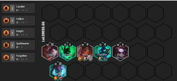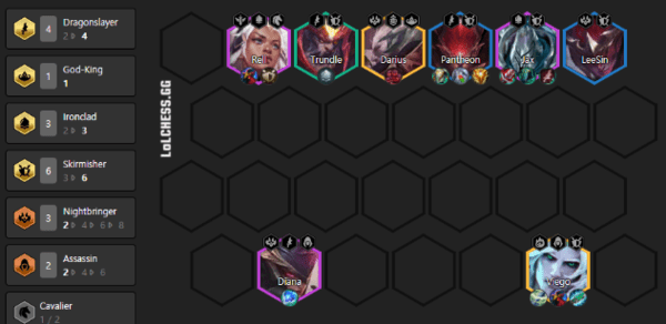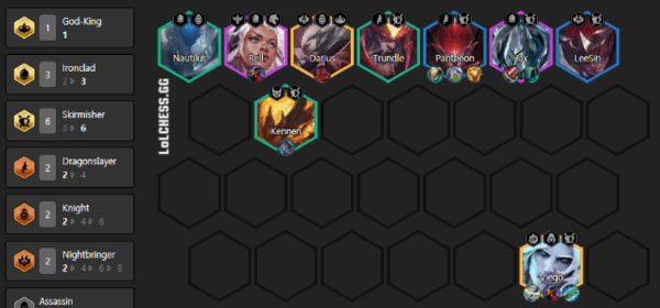 5阶段/决赛圈:如果屠龙牌(皎月铁男)来的早,铁甲没来,就先挂4屠龙,再往后尽量上9去挂任意神王出2暗夜或者2黎明,诺手可以破甲,盖伦可以继承凯南的鬼书,有转职也可以压缩人口停在8一直搜人口,有多余装备做佛耶戈的科技枪复活甲吹风法衣偷偷,诺手的偷偷和任意肉装,如图为无转职的9人口大成阵容,理论上一局能做出一个转职,都能在8级大成型。