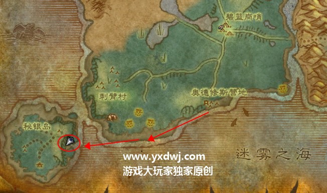 根据下面的路线就可以走过去,然后就可以看到一个插着娜迦旗帜的沙滩。