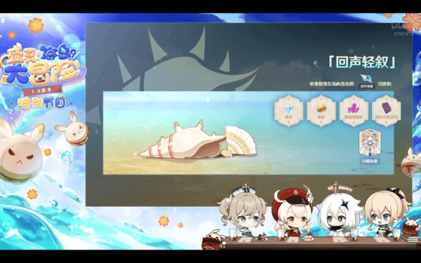 玩家们在我们的游戏中通过完成各个不同的任务来获得回声海螺,回声海螺会出现在各个地图中的岛屿附近,通过收集回声海螺来进行兑换原石、摩拉、材料以及芭芭拉的皮肤奖励。