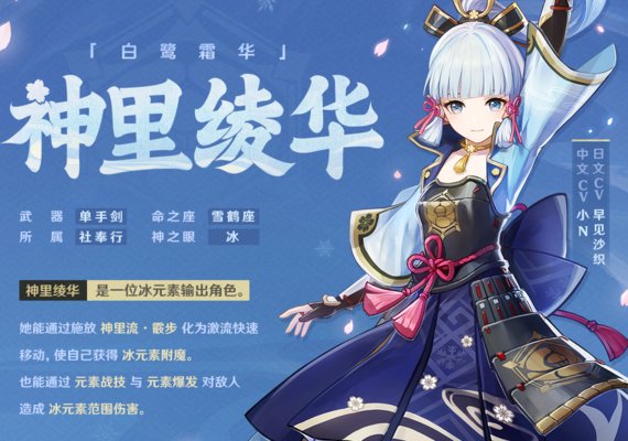 神里绫华,容姿端丽、品行高洁,是深受民众钦慕的人物,作为2.0全新的冰系主c,强大的输出技能和灵活的位移,让神里绫华成为了2.0版本中t0级别的存在。