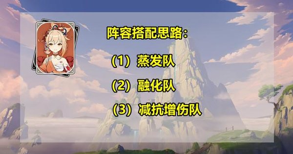 这样一来,宵宫就变成了站场主C角色,阵容搭配思路就比较多了,例如:搭配行秋+班尼特+温迪/砂糖的蒸发队,搭配班尼特+万叶+钟离的减抗增伤队,搭配甘雨+温迪+迪奥娜的融化队。