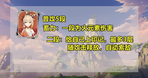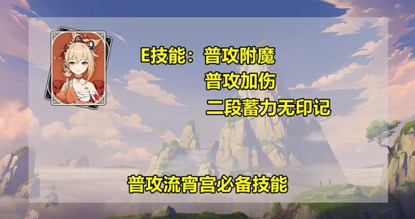 E技能有三个效果:(1)开启附魔状态,普通攻击转化为火元素攻击,(2)提高普攻伤害,(3)E技能持续期间,二段蓄力攻击无法给角色上印记。从这里我们可以得到第二个操作逻辑:以“E技能+普攻”为主要输出手段的普攻流!