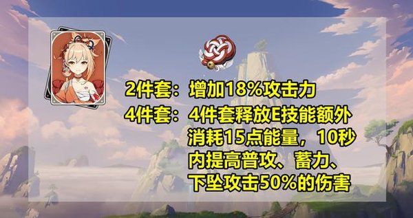 如果选择走这个流派,那宵宫基本上就放弃了大招,圣遗物很有可能是选择后续版本中登场的新圣遗物:2件套增加18%攻击力,4件套释放E技能额外消耗15点能量,10秒内提高普攻、蓄力、下坠攻击50%的伤害。
